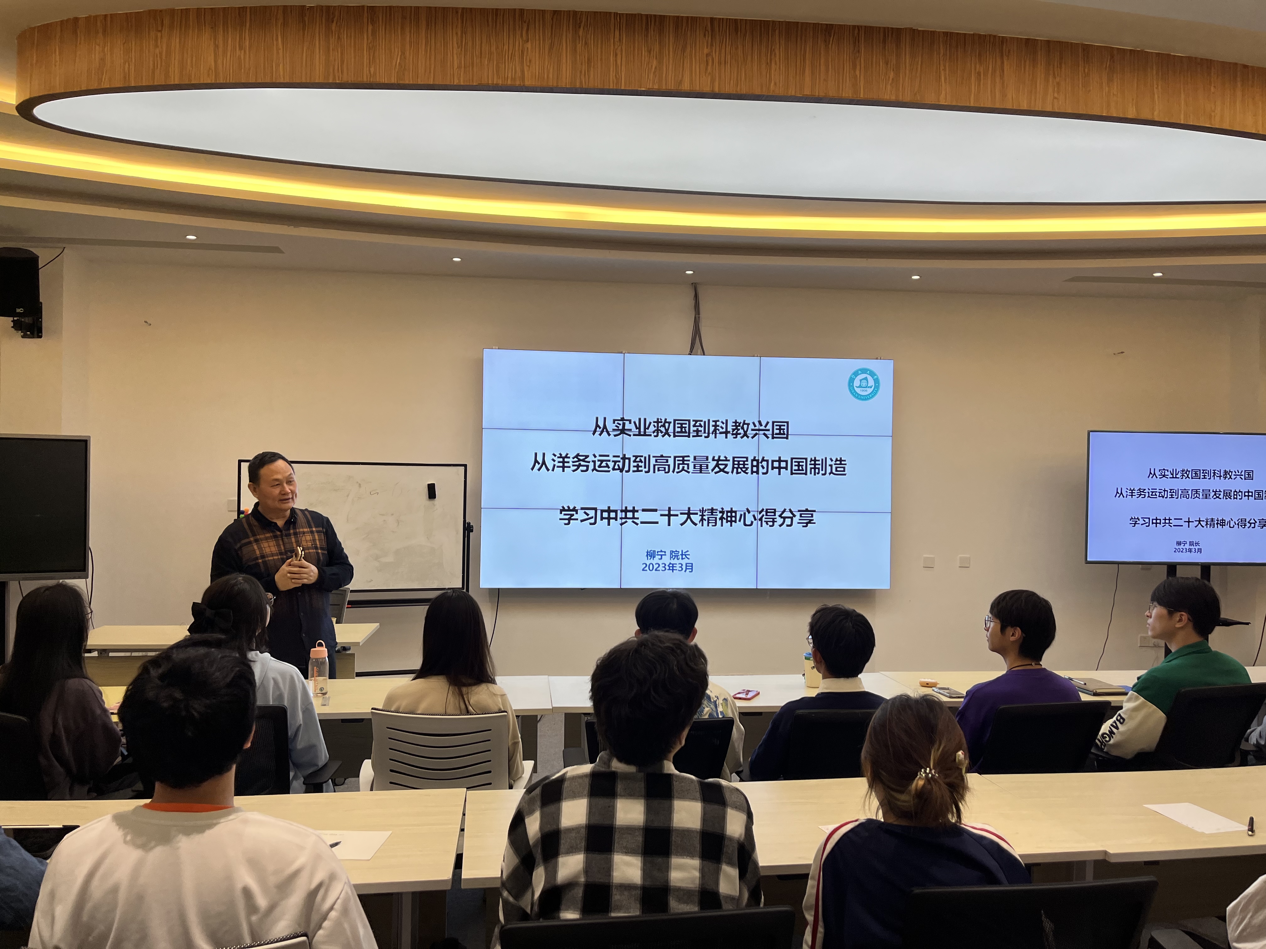 2023年3月8日晚,狂人小说 /人工智能产业学院在实A305会议室举办学习宣传贯彻党的二十大精神专题“思政第一课”,学院院长柳宁教授以“从实业救国到科教兴国,从洋务运动到高质量发展的中国制造”为主题作报告,学院第90期发展对象及部分学生干部共50人聆听了报告。
