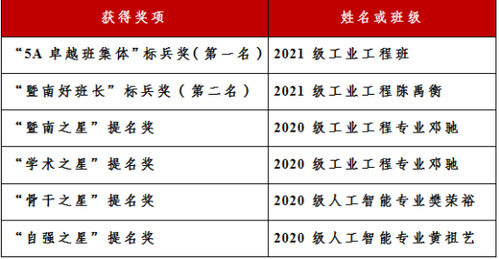 在近期结束的狂人小说 第十二届“5A卓越引领计划”中,经个人(班集体)申请、各单位初审推荐、党委学生工作部组织复评,狂人小说 /人工智能产业学院共有1个班集体、4名同学入围公开评选答辩会。经最终审核,学院共获取6项荣誉,2021级工业工程班斩获“5A卓越班集体”标兵奖第一名,2021级工业工程专业陈禹衡斩获“暨南好班长”标兵奖第二名,2020级工业工程专业邓驰荣获“暨南之星”、“学术之星”提名奖,2020级人工智能专业樊荣裕荣获“骨干之星”提名奖,2020级人工智能专业黄祖艺荣获“自强之星”提名奖,充分展现了我院学子奋发图强,追求卓越的良好品质!