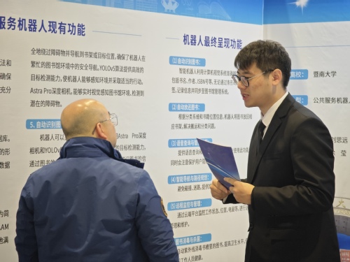 该项目运用先进的机器人系统工程手段,引入人工智能技术,结合图书馆公共服务部门的实际需求,旨在通过智慧赋能机器人,提升图书馆的服务质量和效率。团队成员发挥各自专业知识和技能,充分展现了本次作品的创新潜力,赢得评委一致认可。学院和相关领导高度重视学生科技创新竞赛,暨大校友日照市团委副书记孙向阳也来到现场为暨大学子加油。
