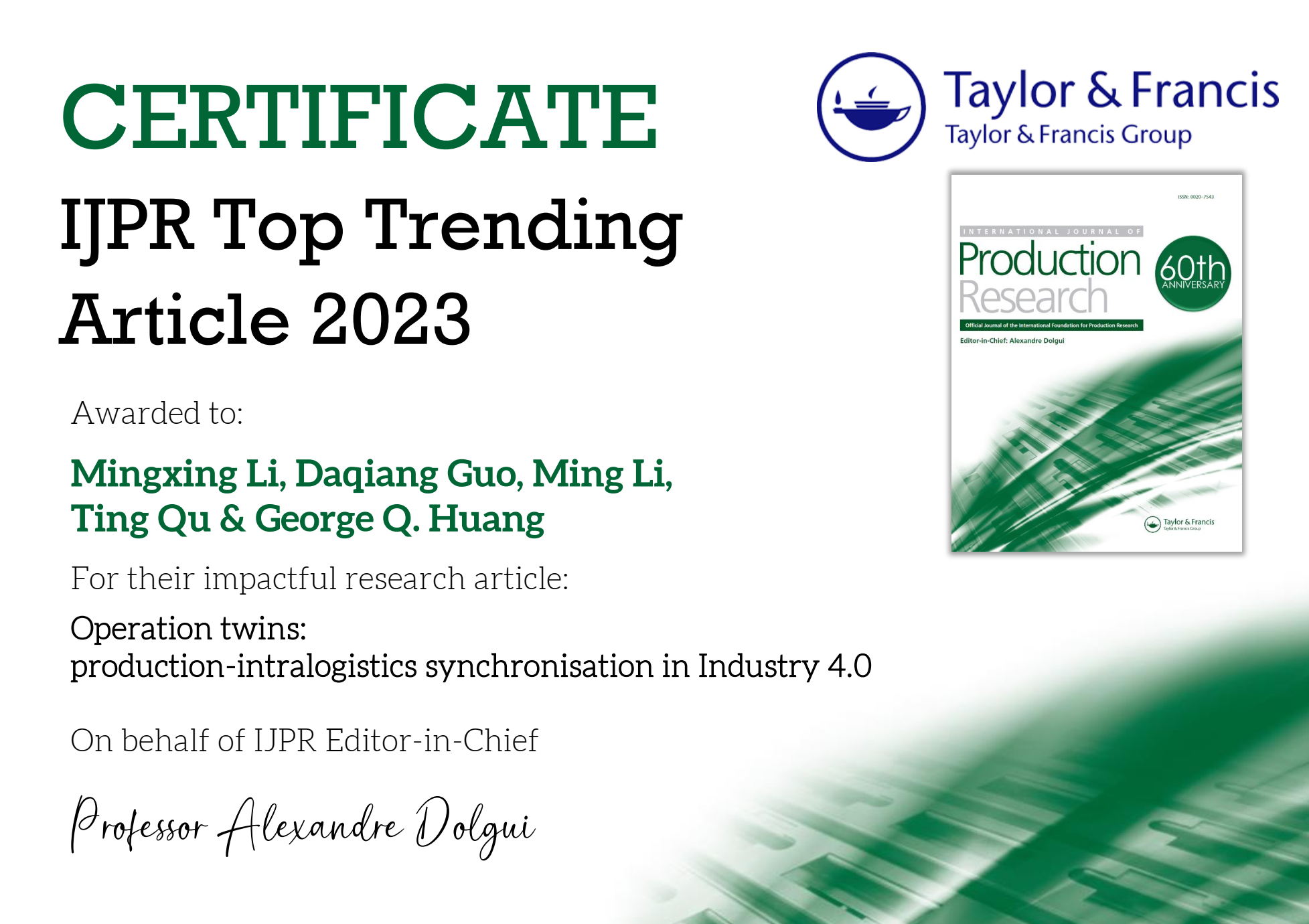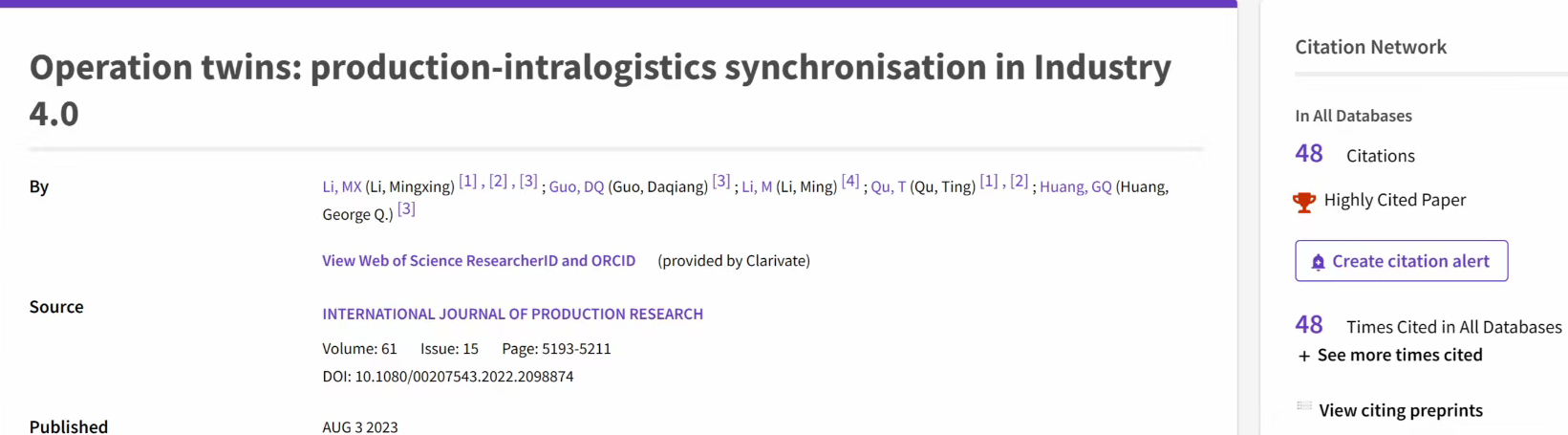 近日,学院屈挺教授、李明星老师团队的论文成果“Operation twins: production-intralogistics synchronisation in Industry 4.0”入选ESI工程领域高被引论文(Highly Cited Paper),并获2023年度IJPR最热门文章奖(IJPR Top Trending Article 2023)。该论文于2022年7月在线发表在国际权威期刊《International Journal of Production Research》(中科院Top期刊,IF=9.2),根据科睿唯安(Clarivate Analytics)公布的最新数据,论文自正式发表以来共在Web of Science被来自世界各地的研究团队引用48次,排名位于工程领域的全球前1%。李明星老师为该论文第一作者,屈挺教授为该论文重要合著者。