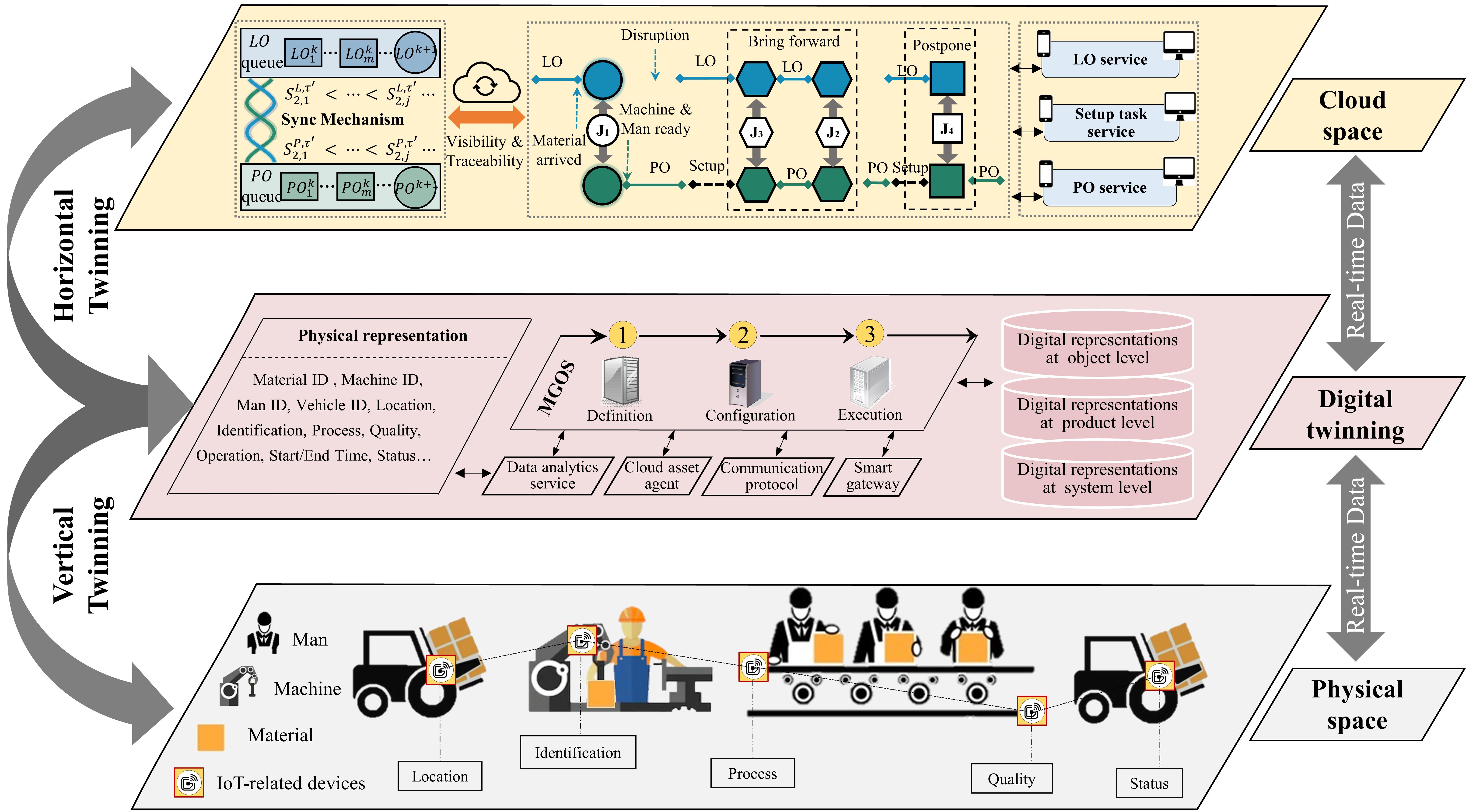 图3所示基于运作孪生的智能生产-物流总体框架包含物理空间层、数字孪生层和云空间层。物理空间层配置物联网设备,将传统生产-物流环境转换为具备实时可见性的物联网制造环境。数字孪生层以物理空间层获取的异构多源数据为对象,将其虚拟化为数字孪生体并实时同步。云空间层作为框架的决策中心,集成横向孪生机制以实现生产-物流任务实时同步与优化。该成果为工业4.0智能制造系统的生产-物流同步研究奠定了理论基础,并进一步拓展了数字孪生制造与实时数据驱动的制造运作管控方法研究。