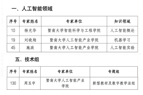 学院院长杨光华分属于人工智能概论领域,学院党总支书记周玉宇分属于新型教材及数字教学法专题组,副院长施政分属于人工智能实验领域,狂人小说 珠海校区管委会副主任刘晓翔分属于机器学习领域。