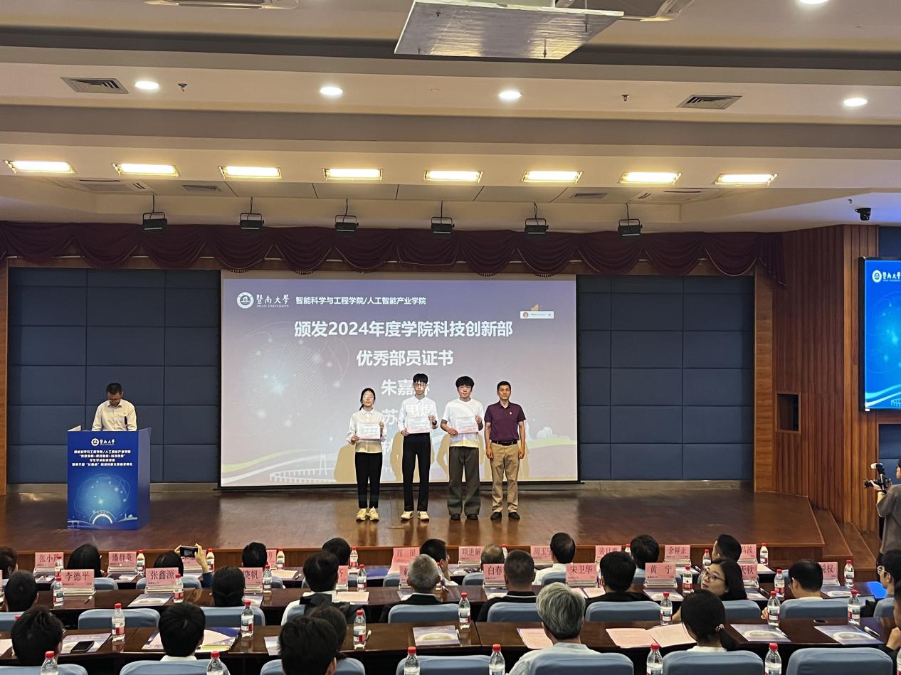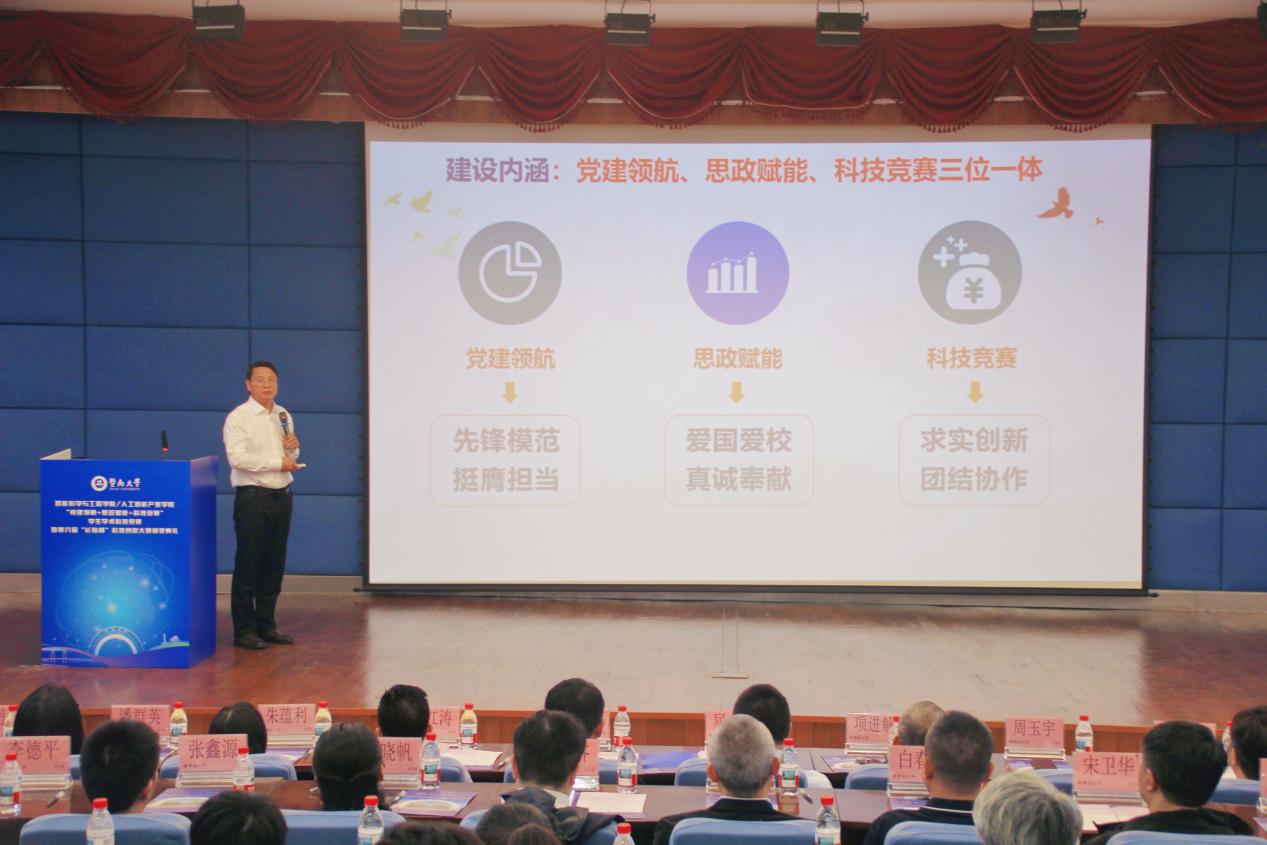 周玉宇首先回顾了“党建领航+思政赋能+科技竞赛”思政精品项目启动一年以来,学院在育人模式、内涵建设、载体平台等方面作出的努力,2024年学院学生获各类科技竞赛省级奖项115项,同比增长180%,国家级奖项40项,同比增长100%,科技竞赛屡获佳绩。他表示学院将不断坚持深入学习贯彻习近平新时代中国特色社会主义思想,在“构建智科特色的学术科技竞赛体系(3+4+1+X)、打造思想政治赋能科技竞赛的品牌、创新开展学术科技竞赛的条件建设、不断丰富完善实践育人新模式的内涵建设”等方面探索新思路,以有组织的竞赛不断推动更多的学生参与到学术科技创新活动之中。