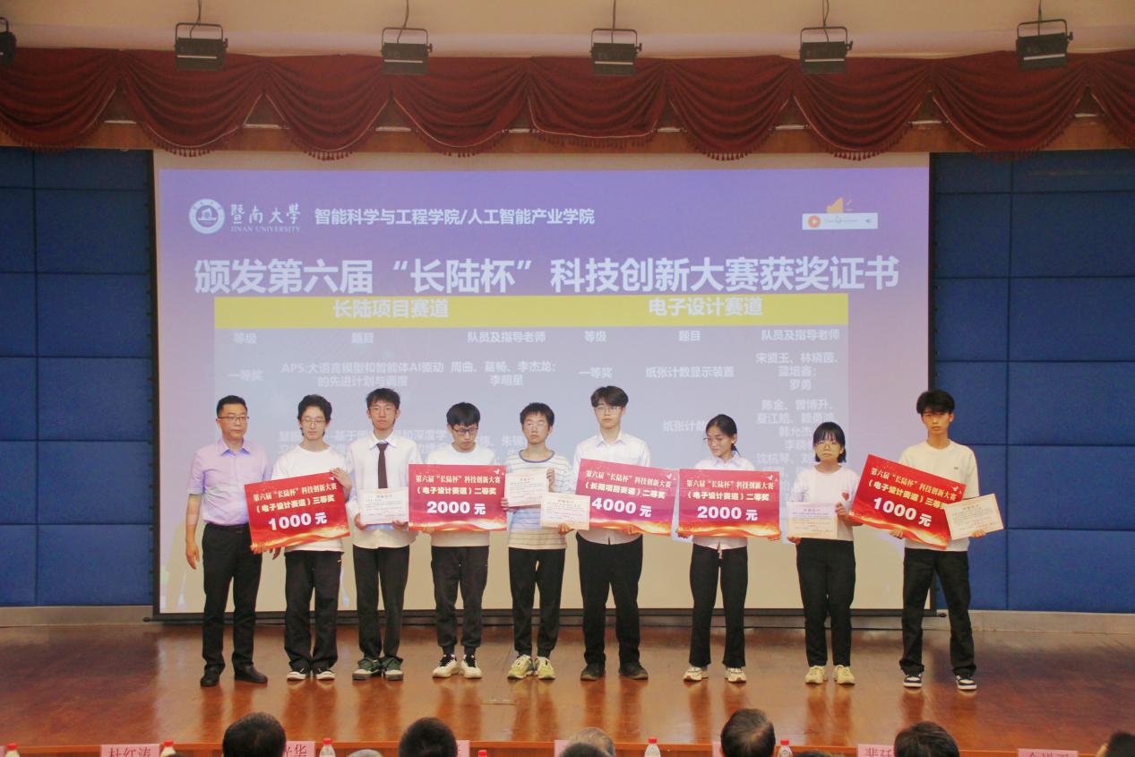 长陆公司副总经理项进解、杜洪涛给第六届“长陆杯”科技创新大赛获奖(电子设计赛道、长陆项目赛道)队伍颁发证书。现场同时颁发了科技创新部优秀部员证书、单项比赛表现突出优异奖证书、学校学术科技竞赛表现突出贡献奖证书、校内外指导老师聘书以及科技竞赛优秀指导老师证书。
