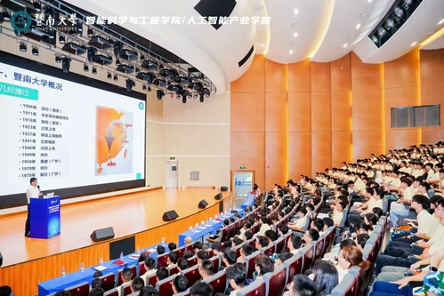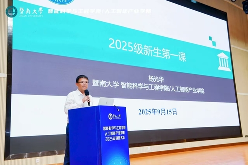 杨光华从学校历史和学院发展、专业特色出发,介绍了学院的人才培养体系和产学研情况,分析了学院各学科和专业之间的内在联系,解读了AI时代对学院创新人才培养的需求情况和具体要求。他从知识学习,能力培养,视野拓展,品德塑造四个方面对2025级全体新生提出了期望,希望同学们在智科院学习期间要“建立知识体系、培养核心能力”“解决实际问题、提升实战水平”“明确未来方向、找到技术价值”“站稳人生脚跟、走得更稳更远”,并勉励同学们将个人理想融入国家和民族的事业中,珍惜在暨南园的每一寸光阴,刻苦学习、增强本领,努力成长为智能科技领域的栋梁之才。